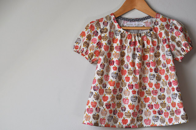 je lui ai tout naturellement proposé d'en coudre un pour son adorable poulette!une petite blouse fruitée s'est ajoutée au tablier, dans un tissu choisi et envoyé par Emma...